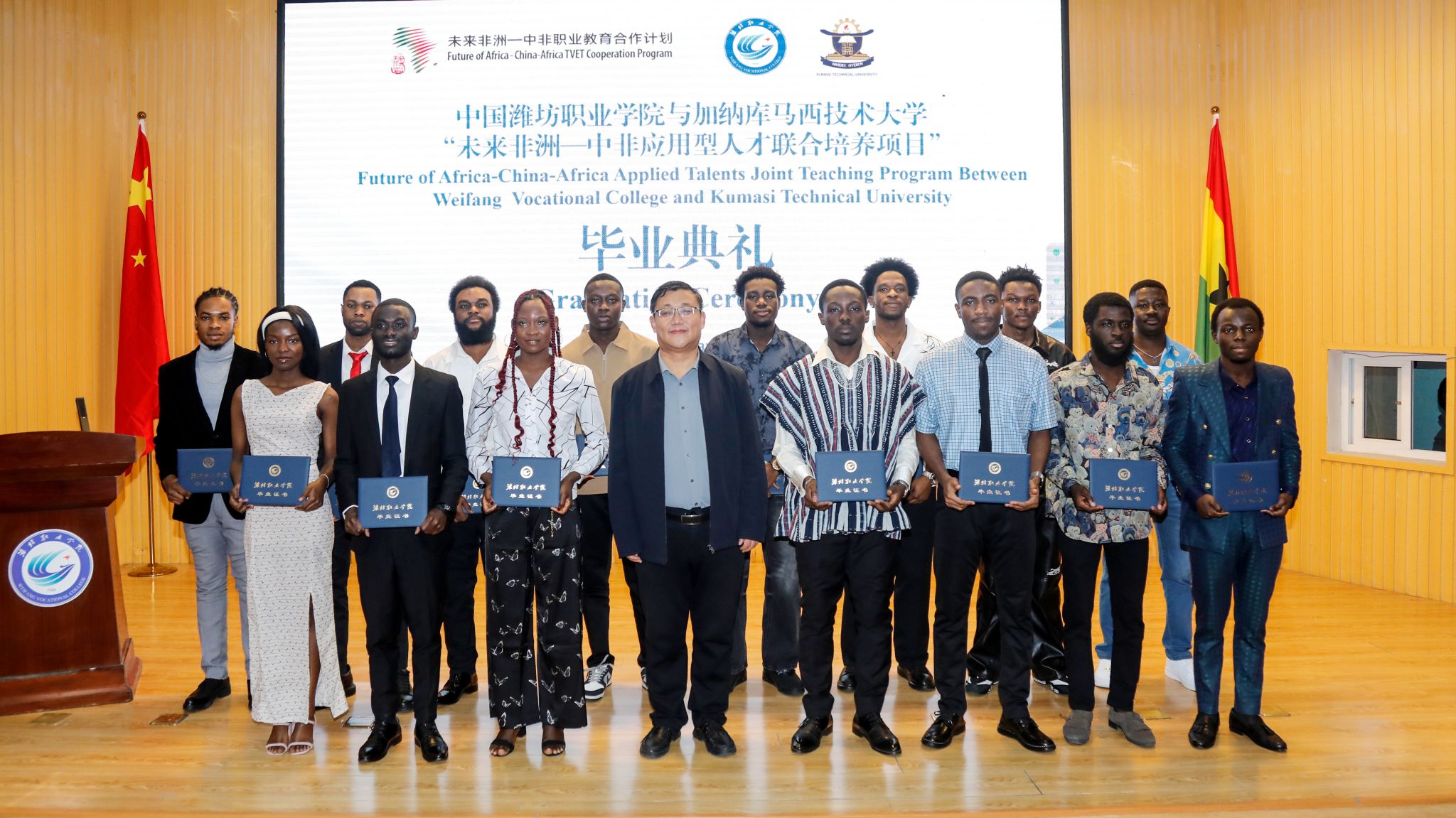 1月9日下午,潍坊职业学院“未来非洲—中非应用型人才联合培养项目”2025届学生毕业典礼在奎文校区6号楼报告厅举行。潍坊市政府副秘书长王霞、学院党委副书记韩瑞东、中共潍坊市委外事工作委员会办公室二级调研员刘国庆、潍坊市公安局出入境管理支队支队长王献平及潍坊市教育局相关领导出席典礼。加纳库马西技术大学校长加布里埃尔·多莫、国际事务联络处处长赛夫·门萨线上参加。学院办公室、国际交流与合作处和机电工程学院等相关部门负责同志及国际教育学院师生参加典礼。学院副院长陈美霞主持毕业典礼。