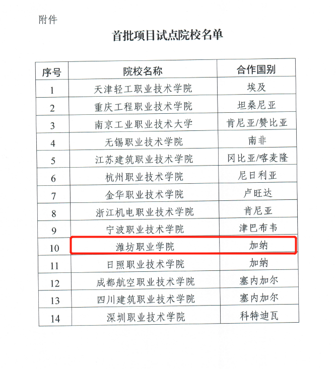 近日,我院入选教育部首批“中非应用型人才联合培养项目”试点院校。全国共14所高等职业院校被确定为“中非应用型人才联合培养项目”首批试点院校,我院积极组织申报,经山东省教育厅推荐成功获批为首批试点院校,与加纳库马西技术大学合作开展机电一体化技术专业人才联合培养和教师培训项目。
