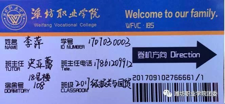 新生来到国际商务学院迎新处,在交上录取通知书办理完相关入学手续后,收到了一张飞往梦想的小小机票。机票上登记着他们的姓名、学号、班主任、班主任电话、宿舍号、班级等信息。这张机票是张信息卡,方便学生记忆班级、宿舍、学号等信息;这张机票是个标签,让学生辨认新同学、认识新同学,找到归属感;这张机票是份书签和纪念,让学生在毕业后都能记得当时入学的情景。有了这张机票就意味着他们开启了一趟崭新的旅程,在这趟旅程中他们会收获知识、友情和历练;有了这张机票就意味着他们正式成为了一名潍职人,要秉承明德、尚学、强能、善技的校训;有了这张机票就意味着他们的梦想正式起航,一往无前飞达梦想的彼岸。(钮洪敏供稿)
