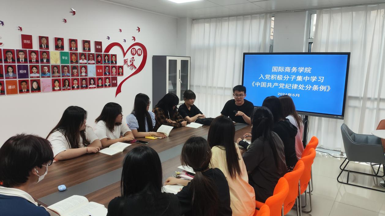 为进一步强化学生纪律意识,加强学生自我约束和管理能力,切实把思想和行动统一到党中央决策部署上来,5月28日,国际商务学院党总支组织学生入党积极分子在“蕙兰”社区举行《中国共产党纪律处分条例》学习活动。