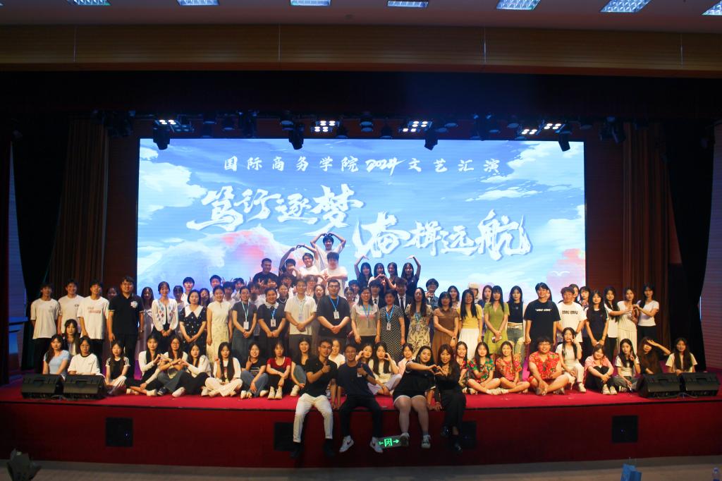 本次文艺汇演共分为“岁月如歌,青春不散场”“星河为路,梦想不打烊”“奋楫争先,笃行向未来”三个篇章。开场舞《小城瑶》以轻盈灵动的步调,舞出了中华传统文化的诗情画意与古韵盎然,将观众的思绪巧妙地牵引至表演之中。小品《今天的幸福》通过幽默诙谐的表演,揭示了珍惜身边人与事的重要性,更教会同学们要把握当下、脚踏实地地去努力。三句半《你我一起话安全》通过曲艺表演独特的击打节奏和押韵技巧,向大家普及了安全常识,让同学们在欢声笑语中增强了安全意识。国际商务学院师生共同登台带来的歌曲《离别开出花》,将晚会的氛围推向了高潮。随着歌声响起,背景屏上重现了一幕幕精彩的校园生活瞬间:文艺晚会的欢声笑语、运动赛场的拼搏奋进、日常活动的谈心交流以及离校前的集体合影……每一帧画面都充满了深情与回忆。在师生互送祝福环节,我院分管学生工作同志、辅导员老师依次向同学们送上了真挚而美好的祝福,同学们也纷纷向学院和恩师表达了感激之情。