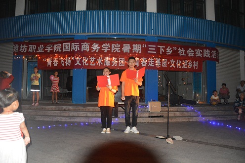 由辅导员老师的带领的“青春飞扬”文化艺术服务团队,在2018年7月12日抵达昌邑县开展了为期六天的文艺汇演、走访党员、社会调查等活动。