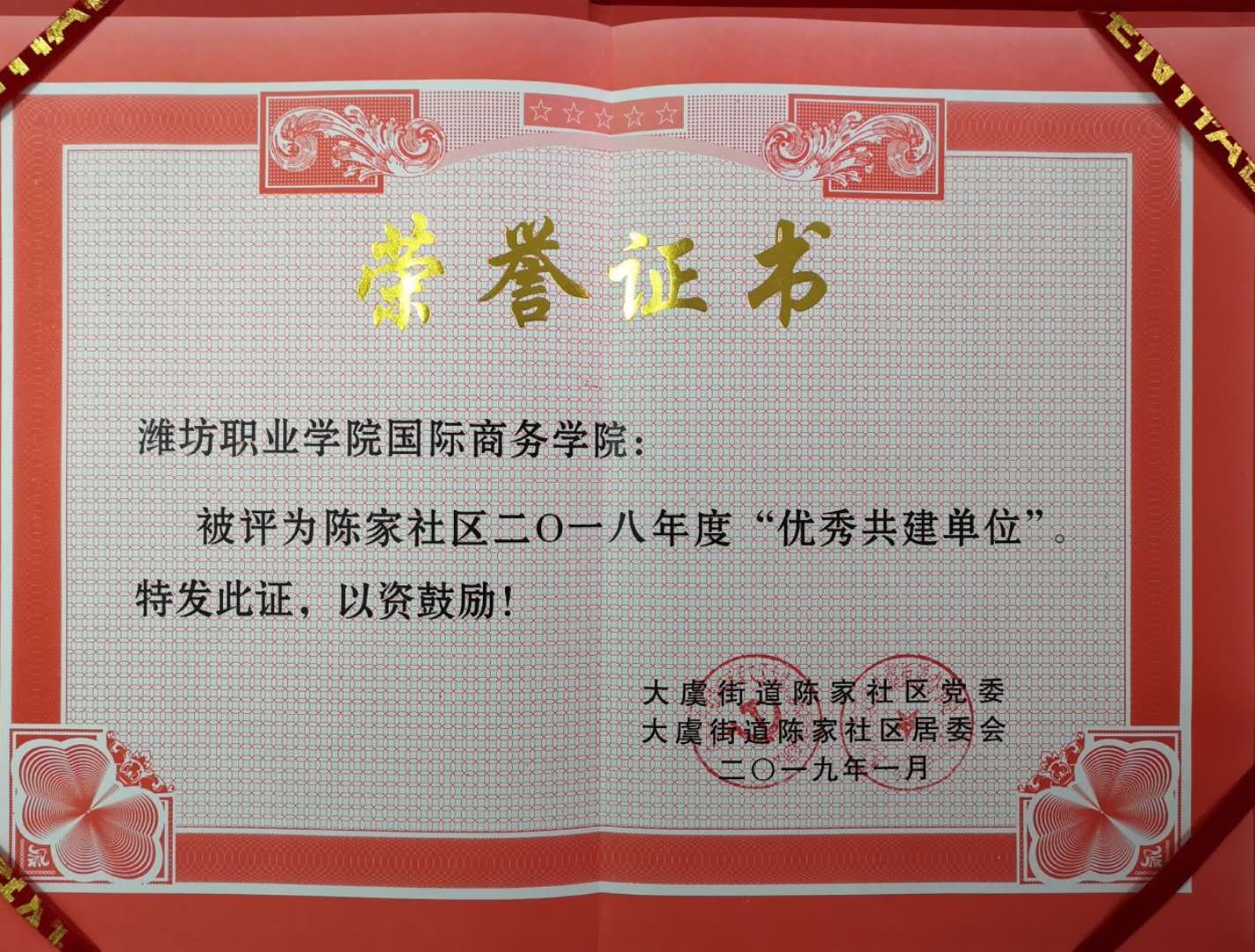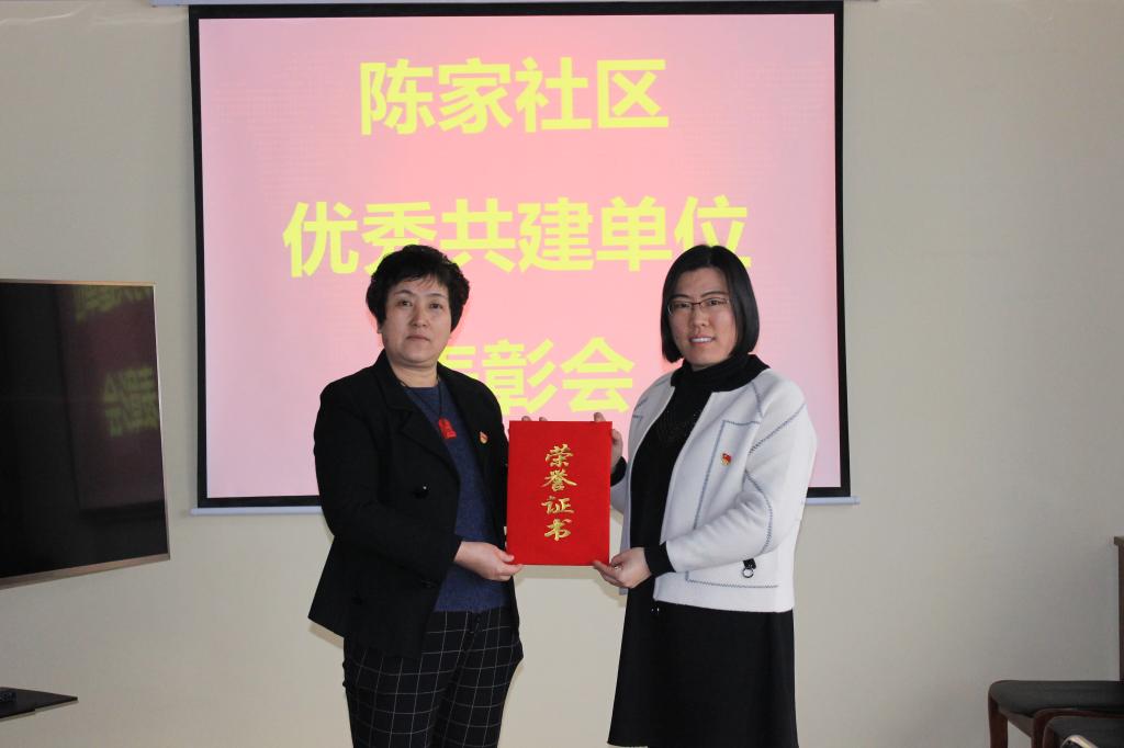 近日,在大虞街道陈家社区召开的表彰会上,我院被评为陈家社区2018年度“优秀共建单位”,这是我院继2017年被评为“社区突出贡献共建单位”之后再获表彰。