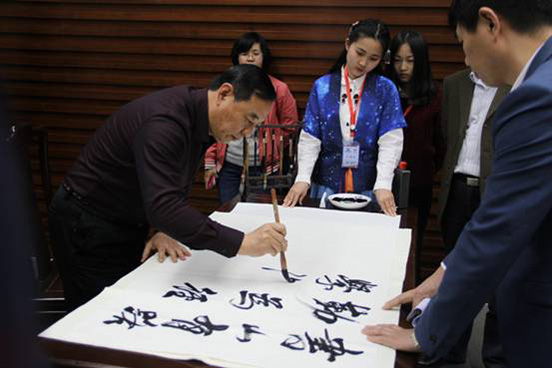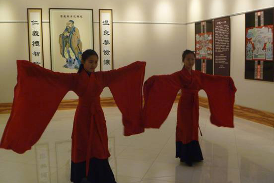 参与活动的学生主要来自国际商务学院“裳衣”汉服社团,这些学生由于对中国传统文化的热爱和对汉服的喜爱走到一起成立了社团,并定期举行活动。她们身着古朴典雅的汉服,为现场嘉宾表演了汉舞《礼仪之邦》,精彩表演获得现场阵阵喝彩和热烈掌声。随后,又作为志愿者为现场挥毫泼墨的嘉宾提供了志愿者服务。服务期间,同学们举止优雅,谈吐大方,得到嘉宾和潍坊市图书馆工作人员的一致好评。学生们还走进六艺堂,在孔子像前行礼,感受孔子的伟大思想;参观了潍坊历史名人文化展、潍坊市珍贵古籍书影展;参与国学经典诵读活动,与嘉宾们一起诵读了《大学》、《中庸》选段;另外还体验了木板年画刷印、棋艺。