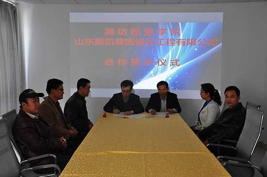 4月3日上午,师范/文化创意学院主要负责同志带领广告设计与会展专业骨干教师和产学研办公室相关同志,到山东顺凯装饰设计工程有限公司考察调研,并与该公司签订了校企合作协议,同时在该公司进行了“潍坊职业学院校企合作基地”、“潍坊职业学院企业教师工作站”、“潍坊职业学院企业工地课堂”的挂牌仪式。