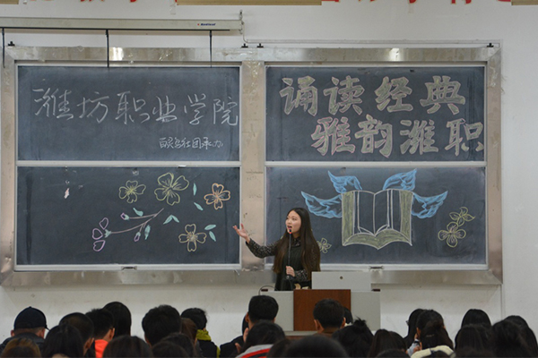 为喜迎潍坊职业学院六十周年校庆,秉承“明德、尚学、强能、善技”的校训,提升我院大学生的思想道德素质和文明修养,10月27日,国际商务学院在奎文校区举办主题为“诵读经典,雅韵潍职”的经典诵读比赛。