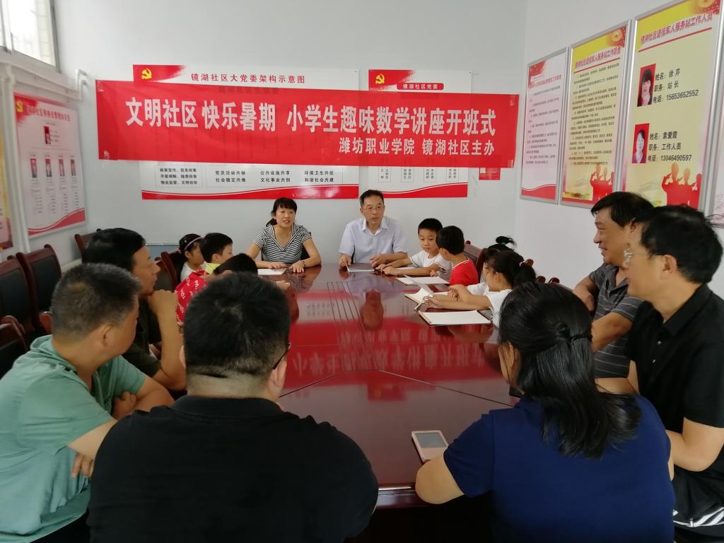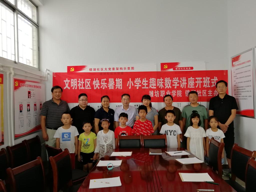 8月23日上午,由通识教育中心、化学工程学院、科技处、资产管理处、纪委监察审计处五支部“双报到”工作小组与寒亭街道镜湖社区共同举办的“文明社区 快乐暑期”小学生趣味数学讲座开班式在镜湖社区举行,“双报到”工作小组成员、镜湖社区领导、社区小学生们参加了开班式并进行了第一场讲座。