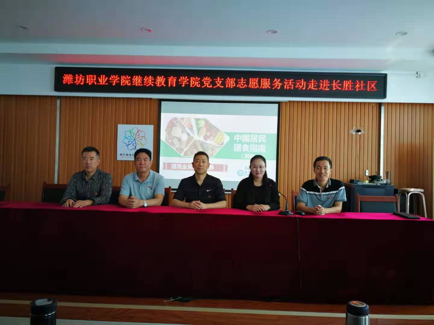 9月24日,继续教育学院党支部走进潍城区长胜社区,开展以“合理饮食,健康生活”为主题的“双报到”为居民普及健康知识志愿服务活动。
