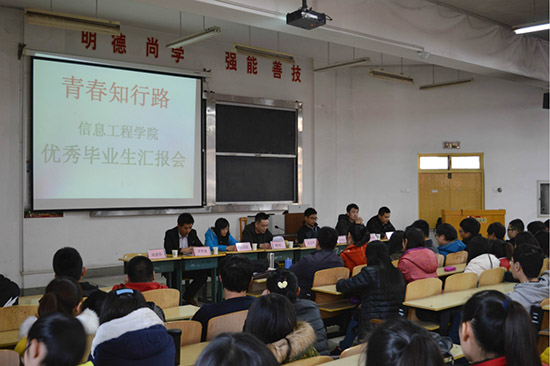 11月13日下午,信息工程学院在奎文校区举办“青春知行路”优秀毕业生汇报会。来自2010级的6名优秀毕业生代表分别作了报告,2014级新生参加。