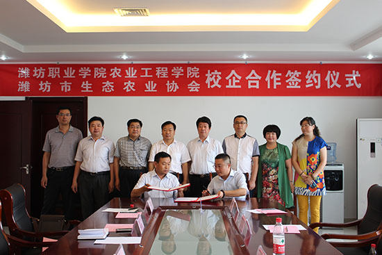 与会人员集体观看了学院宣传片。双方共同签署了《潍坊职业学院与潍坊市生态农业协会战略合作协议》,随后双方就资源共享、科研交流、学生实习等方面展开了座谈交流。