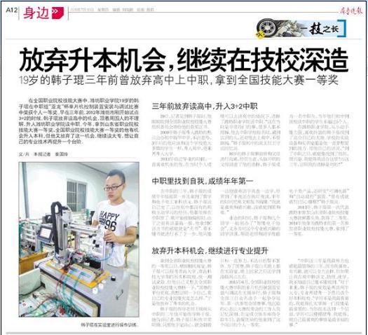 在全国职业院校技能大赛中,潍坊职业学院19岁的韩子琨在中职组“亚龙”杯单片机控制装置安装与调试比赛中荣获个人一等奖。早在三年前,2012年潍坊市刚开始试点3+2的时候,韩子琨放弃读高中的机会,顶着周围人的不理解,升入潍坊职业学院读中职。今年,拿到山东省职业院校技能大赛一等奖、全国职业院校技能大赛一等奖的他有机会升入本科,但他又放弃了这一机会,继续读大专,想让自己的专业技术再提升一个台阶。