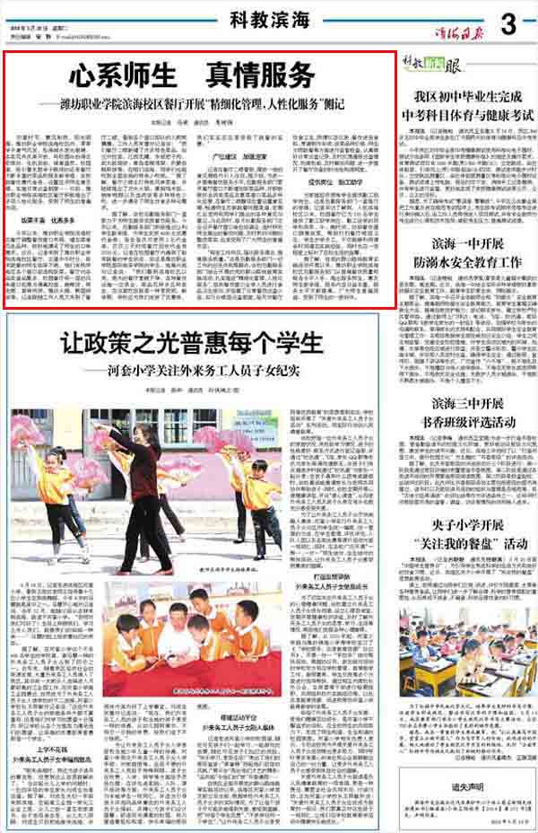 据了解,自党的群众路线教育实践活动开展以来,潍坊职业学院滨海校区后勤服务部门从提高餐饮质量和服务水平入手,推出服务师生、惠及师生新举措,服务内容日益丰富,服务水平不断提高,广大师生普遍受益,这是后勤服务部门开展党的群众路线教育实践活动为师生做好事、解难事、办实事的一种具体体现。