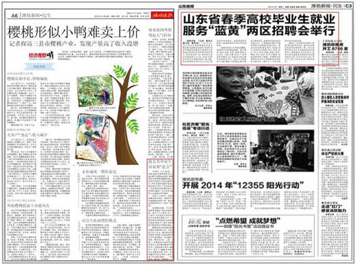 24日上午,2014年山东省春季高校毕业生就业集中招聘活动服务“蓝黄”两区专场招聘会暨潍坊职业学院学生顶岗实习双选会在奎文校区举行,来自省内外500多家用人单位前来选聘人才。其中不乏潍柴动力、海尔集团、北汽福田、香港体会国际时尚有限公司、上海通用五菱汽车股份有限公司等国内知名企业。参会单位提供就业岗位10000余个,涉及经贸、机械、电子、农业、市场营销等多个领域。