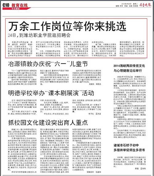 本报5月19日讯(记者 李涛 通讯员 钟召平 孙媛)19日,记者采访获悉,“山东省2014年春季高校毕业生就业集中招聘活动服务‘蓝黄’两区专场招聘会暨潍坊职业学院学生顶岗实习双选会”将于24日在潍坊职业学院奎文校区举行,600余家企事业单位将提供10000余个工作岗位。