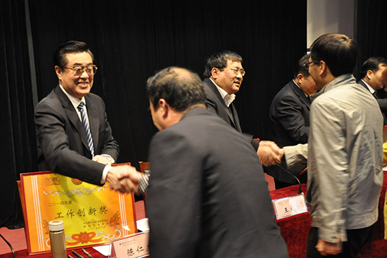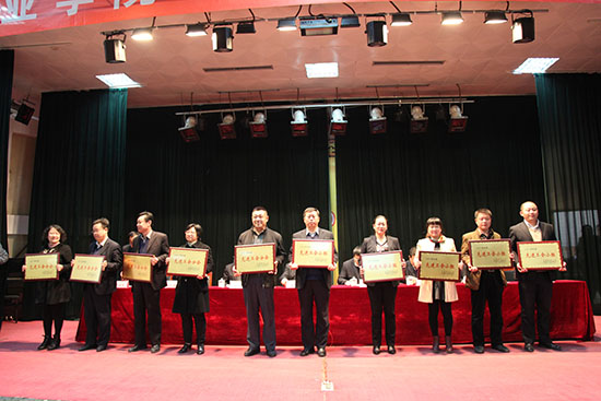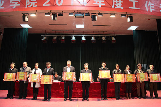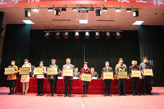 学院党委副书记宋桂言宣读了表彰决定。学院领导为先进集体及先进个人代表颁奖。获得2014年度先进集体、目标管理责任制考核单项奖、工作创新奖、先进基层科室等荣誉称号的部门代表,获得2014年度优秀教育工作者、优秀教师、十佳辅导员、科研工作先进个人等荣誉称号的代表,以及获得2014年度先进工会分会、先进工会小组等荣誉称号的部门代表和获得2014年度工会先进个人荣誉称号的代表上台领奖。