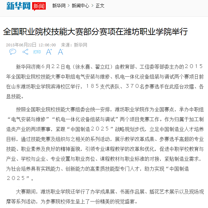 6月13日至15日,2015年全国职业院校技能大赛中职组电气安装与维修、机电一体化设备组装与调试两个赛项在我院滨海校区举行。新华网及光明日报等多家媒体作了报道。新华网报道全文如下。