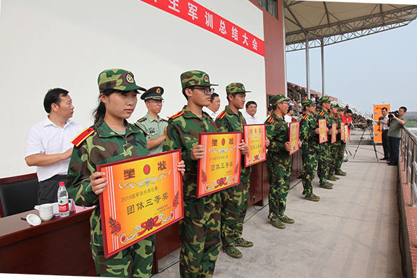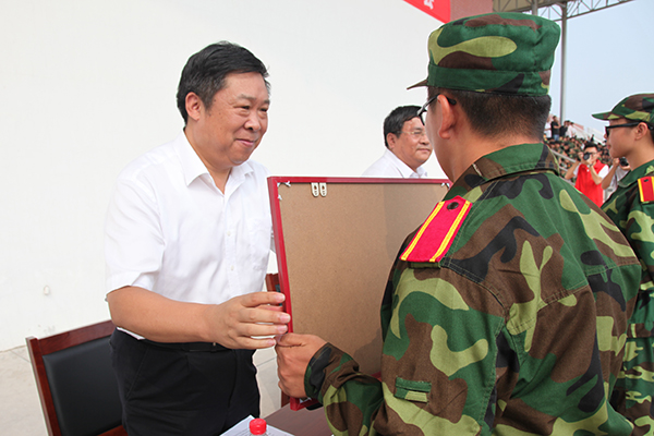 贺志强宣布军训表彰决定。学院领导和部队首长为受表彰的军训先进集体和个人代表颁奖。