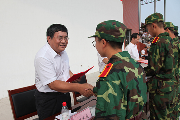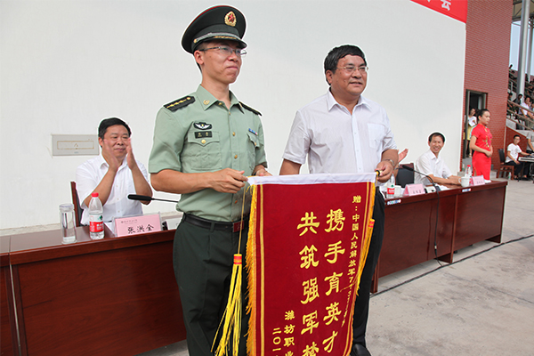 张洪全发表讲话。他代表学院向承担军训任务的部队首长和全体教官表示感谢,向参加军训的全体同学表示问候,向受表彰的先进集体和个人表示祝贺。他说,今年全院有5200多名中高职新生参加了滨海、奎文校区的军训。军训期间,广大受训同学在全体教官和辅导员、班主任的严格要求下,不怕苦,不怕累,严明纪律,听从指挥,刻苦训练,顽强拼搏,学到了军事知识和技能,增强了国防意识,激发了爱国热情,增强了集体主义精神和合作意识,用辛勤的汗水和踏实的行动,上好了大学生活的第一课,交出了大学生活的第一份圆满答卷。他希望同学们把军训中养成的好作风带到今后的学习和生活中去,树立远大理想,明确奋斗目标,刻苦学习,锤炼品德,增强就业创业本领,做到德智体美全面发展,成为对国家、社会和家庭有用的高素质技能型人才,为实现中华民族伟大复兴的“中国梦”贡献力量。
