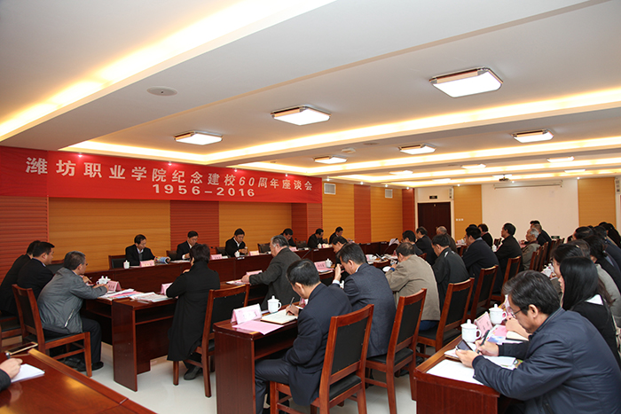 为纪念建校60周年,总结办学经验,凝聚人心,鼓舞士气,10月27日上午,我院在滨海校区清泽楼会议室召开“纪念学院建校60周年座谈会”。学院党委书记张洪全,院长王家爱,党委副书记宋桂言,副院长赵君堂,纪委书记李瑞昌,在职原领导班子成员,历任党委书记,原昌潍农业学校、潍坊市职工大学、潍坊师范学校、潍坊第一职业中专学校校长和离退休人员代表,部分管理部门和各二级学院行政主要负责人以及教师代表50余人参加座谈会。会议由宋桂言主持。