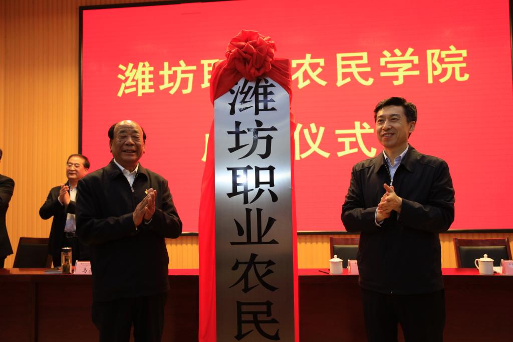 4月16日上午,潍坊职业农民学院成立仪式在学院奎文校区隆重举行。潍坊市委副书记、市长李宽端出席仪式并与党的十九大代表、寿光市三元朱村党支部书记王乐义一起为潍坊职业农民学院揭牌。市委常委、组织部部长林红玉主持仪式,副市长马清民讲话,学院党委书记张洪全、院长王家爱出席,市直相关部门、学院领导以及部分涉农企业、兄弟院校主要负责同志,我院中层干部及师生代表140余人参加仪式。