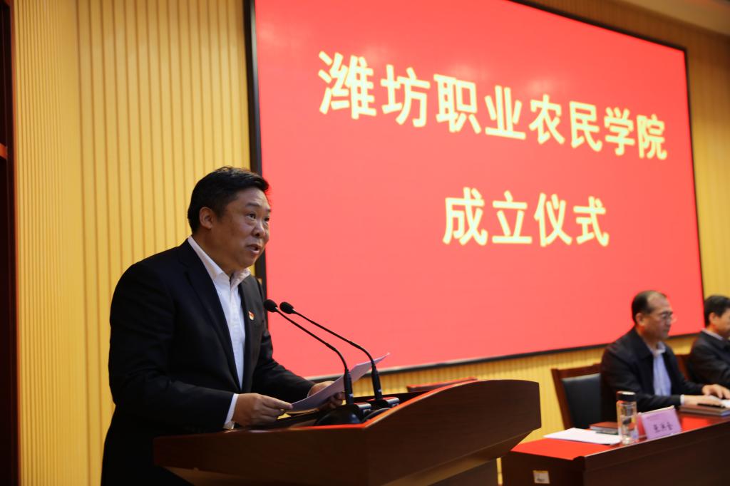 张洪全汇报了潍坊职业农民学院的组建情况。他说,组建成立潍坊职业农民学院,体现了市委、市政府和社会各界对学院办学实力的认可,是对学院的充分信任和支持。潍坊职业学院有六十多年农业教育办学历史,具备为农业农村发展培养人才的专业人才优势,有农业人才教育培训的良好平台和丰富经验。乘借大力实施乡村振兴战略的东风,我们一定牢记使命,勇于担当,主动承担起为农业农村发展培育人才的重任。他表示,学院近期将重点开展种植技术、农业工程和经济管理三个专业类培训,开设公共基础课、专业核心课和能力拓展课三大类课程,开展全日制学历、农民大学生成人学历、职业技能培训、农技人员在职继续培训、特色短期培训五类教育培训,设置“中高特”三级课程体系和师资库,实施“三大课堂”教学培训模式。在办学过程中,一是认真学习,主动担当。牢记乡村振兴的任务目标,深入社区村庄、田间地头、大棚车间,了解把握农民的知识、技能需求,急农村所需,教农民所盼,不断提升教学水平,把论文写在农民致富奔小康的道路上。二是因材施教,开放办学。把培训送到农村去,送到生产现场中,主动对标国内国际先进标准,培育有现代观念、国际眼光的高素质技术技能人才。三是尊重规律,提高质量。既教理论更教技能,既教业务更育人才,培养成为社会主义新农村的建设者、带头人。四是严守规矩,规范办学。坚持教育的公益性,清清白白办教育,一心一意育人才,决不辜负市委市政府的重托和全市广大农村干部群众的期待,为打造乡村振兴“潍坊模式”贡献力量。