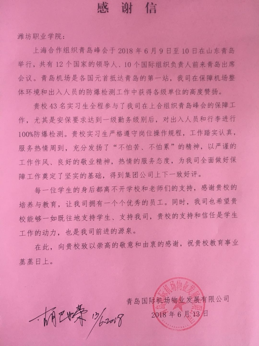 经过前期两周的适应期,学生们在6月份青岛上合峰会召开期间,在工作岗位上以标准的动作、得体的举止、规范的语言等服务于每一位通过青岛机场的中外旅客,她们的出色表现为青岛上合峰会亮出了防爆安检的新名片,得到了机场领导和过往旅客的交口称赞,树立了机场安检的良好形象,也为潍坊职业学院赢得了良好的社会口碑。(梁延安 李桂杰供稿)