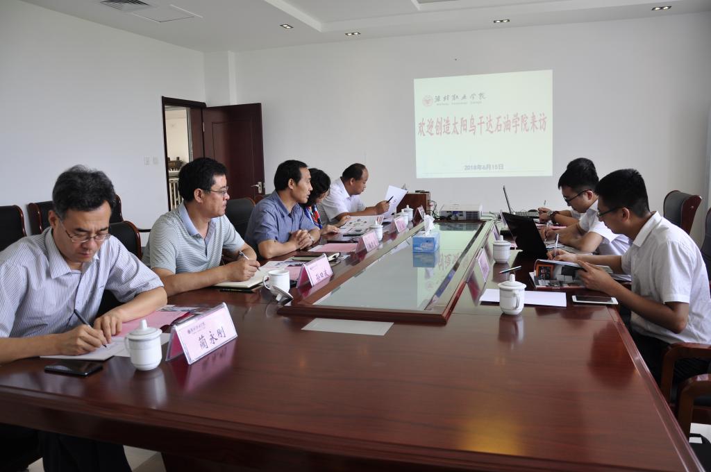 座谈会上,赵君堂代表学院对客人的来访表示欢迎,向客人介绍了学院的校史概况、专业设置、技能大赛、国际交流、留学生教育及援非项目培训等方面的情况。段晓飞介绍了创造太阳乌干达石油学院的建设背景、发展历程及适应乌干达国家需求确定的发展规划。会谈中,双方结合我院的优势专业及乌干达农业发展需要,就农业及机电类专业教育资源输出及技术技能培训进行了深入交流,并达成初步合作意向。双方表示将进一步制定相关计划进行深入对接,将合作项目落到实处。