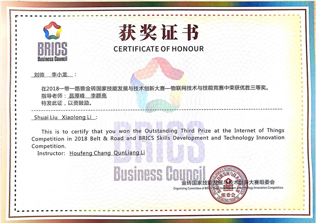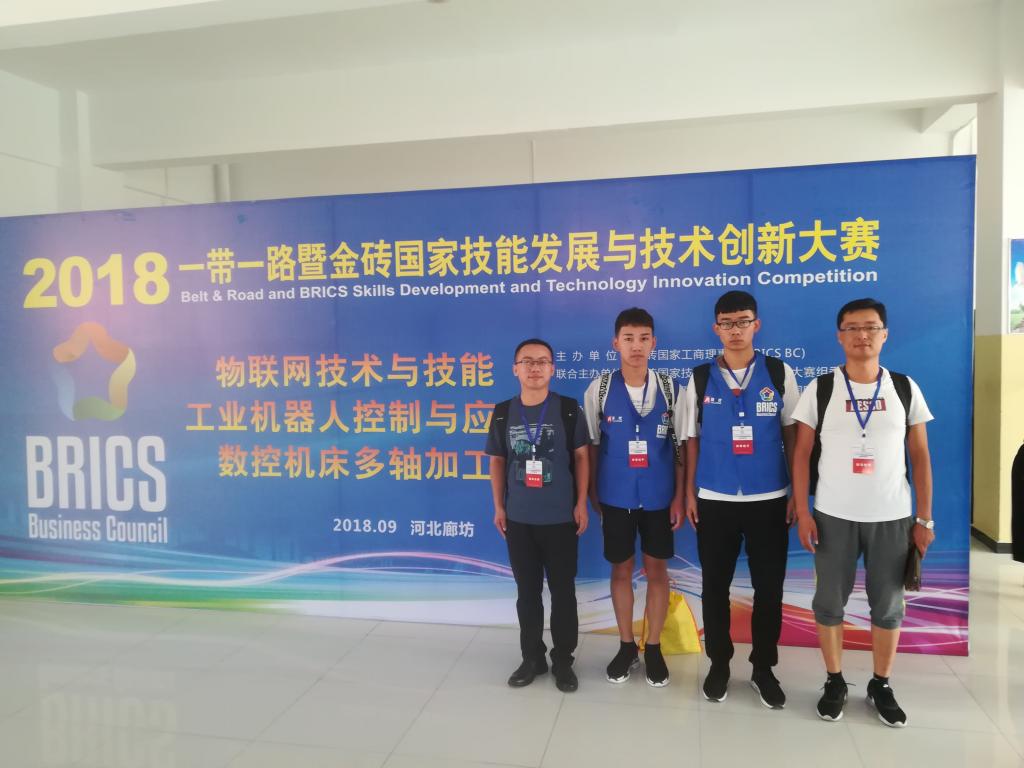9月4日—8日,“一带一路”暨金砖国家技能发展与技术创新大赛闭幕赛——物联网技术与技能赛项中国赛区决赛在河北廊坊职业技术学院举办,此次决赛共有来自全国各地的20余支队伍参赛。我院信息工程学院学生刘帅、李小龙,指导教师李群亮、昌厚峰,经过两个月的积极备战,克服困难,自制模拟软件与设备认真训练,最终在比赛中获得三等奖。
