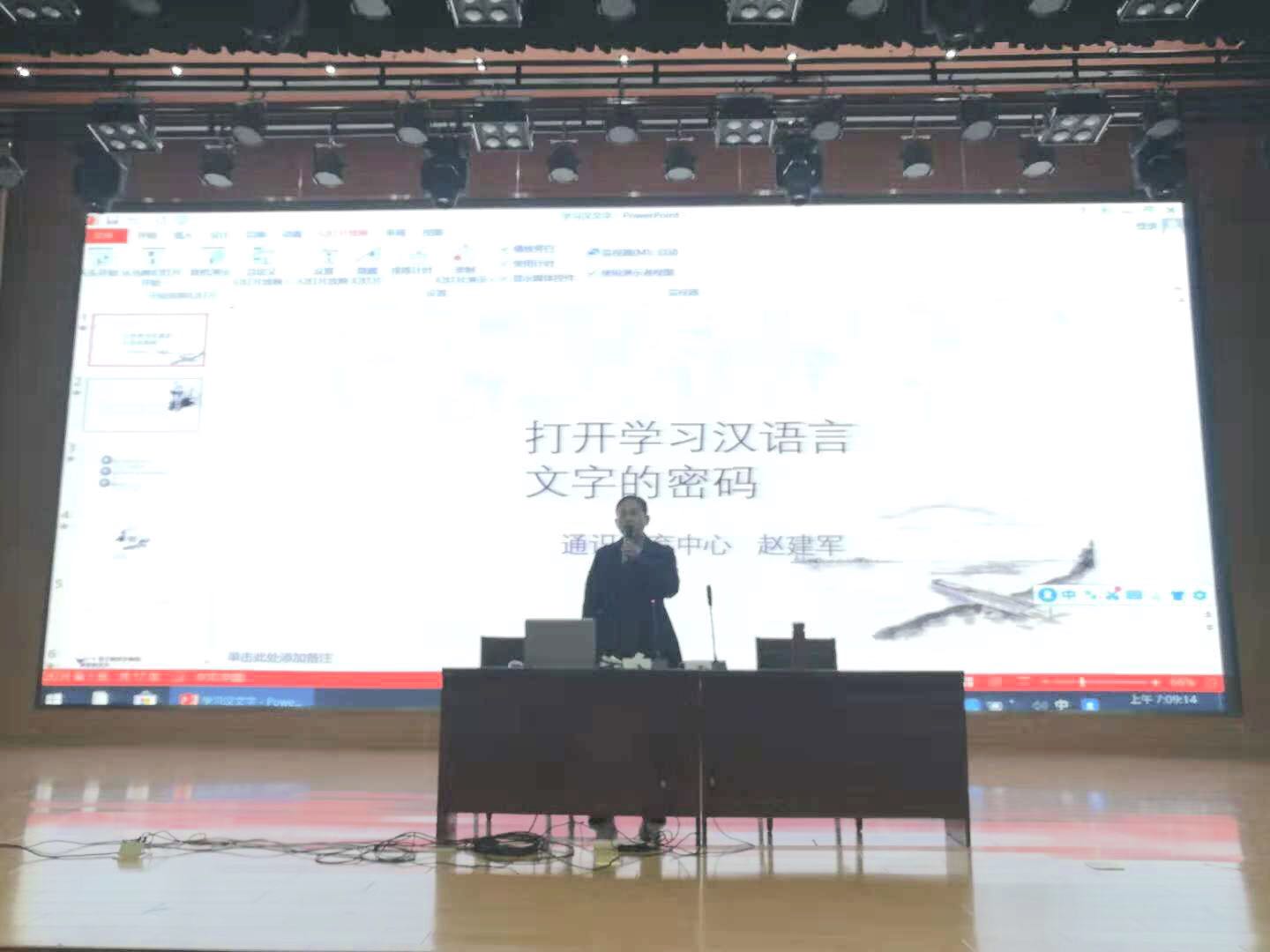 中华汉字形美如画、音美如歌、意美如诗,本场报告为同学们打开了深入理解汉字和中国文化之门,让同学们认识到汉字是世界上最古老、最有生命力的文字,它记载了古圣先贤的智慧,浓缩了中华民族的情怀。报告极大地提升了大家的民族自豪感和自信心,让同学们深知:世界上有一个伟大的国家,她的每个字都是一首优美的诗、一幅美丽的画,这个国家就是中国。(耿晓哲供稿)