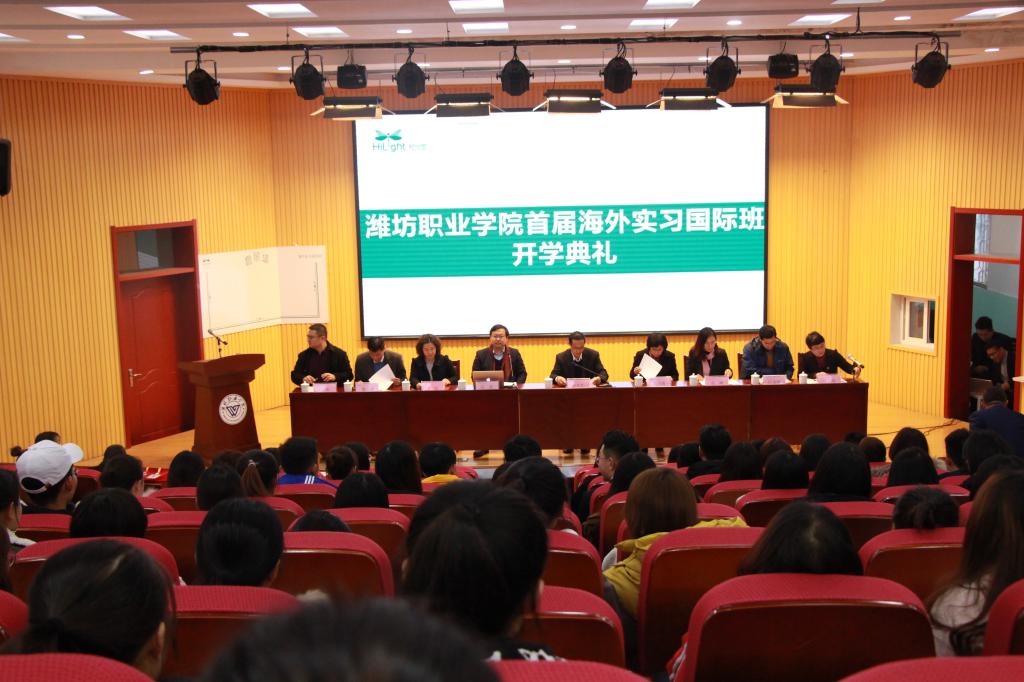 12月20日下午,我院首届海外实习国际班开班仪式在奎文校区创业中心报告厅举行。学院副院长赵君堂、潍坊市商务局外经科科长刘月霞、东昊华晨董事长邱嵩、国际交流合作处、科技处、招生就业处和国际商务学院主要负责同志、国际班学员及家长代表共同参加开班仪式。