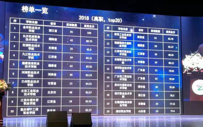 根据《2018年全国普通高校竞赛评估结果(高职)TOP100》榜单公示,我院位列全国高职院校第20位,位列山东省高职院校第1位。据《2014一2018年全国普通高校竞赛评估结果(高职)TOP300》公示,我院位列全国高职院校第34位(纳入统计的高职院校共1424所),位列山东省高职院校第5位。