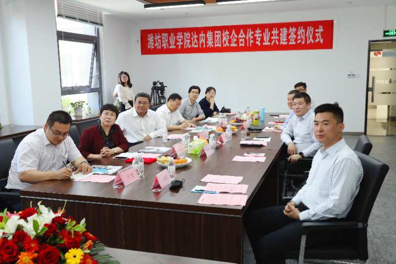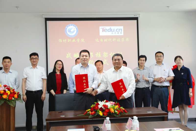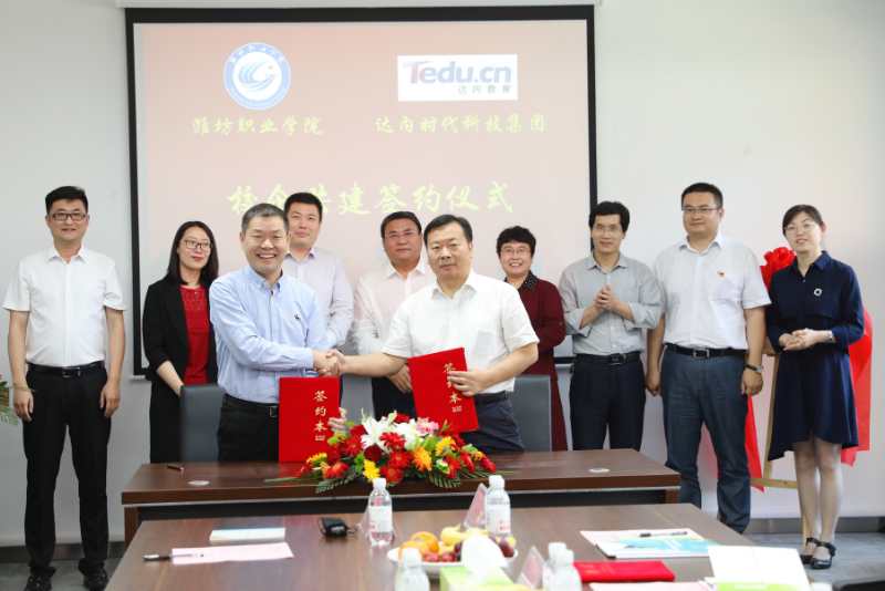王家爱与谢远庆共同签署了《潍坊职业学院与达内时代科技集团战略框架合作协议》,贺志强与侯增辉共同签署了《潍坊职业学院与达内时代科技集团共建专业合作协议》。王家爱为“潍坊职业学院校外实习基地”授牌。褚志梅为吴慧青颁发企业实训教学专家聘书。吴慧青介绍了共建专业的行业发展情况及人才培养方案。