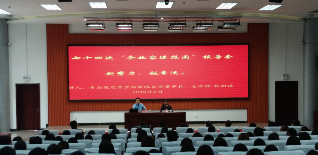 6月13日,潍坊职业学院第74次企业家进校园活动在滨海校区明德讲堂举办。青岛波尼亚食品有限公司董事长赵向进以“努力奔跑,我们都是追梦人”为题,为食品药品学院教师和食品专业300余名同学作了一场精彩报告。报告会由食品药品学院负责人主持。