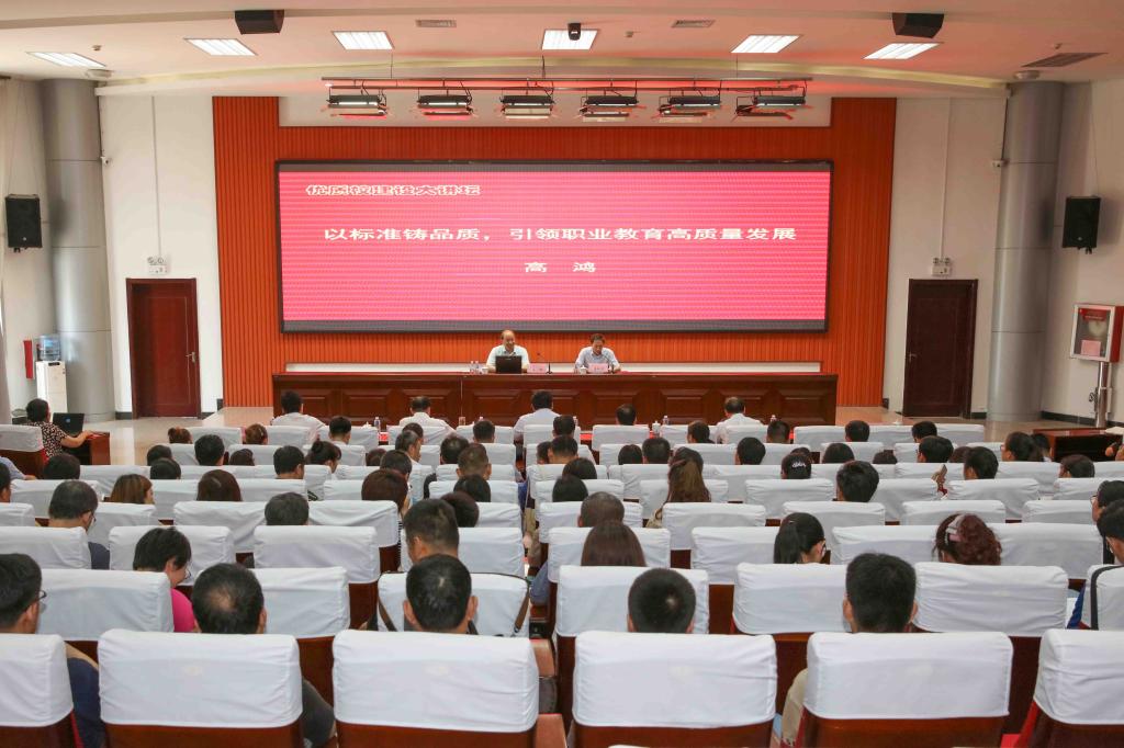 为持续推进学院优质高职院校建设,推进职业教育标准化,6月14日下午,优质校建设大讲坛第十一讲在滨海校区清泽楼报告厅举行。学院邀请中国职业技术教育学会常务理事、全国职业教育集团化办学专家组副组长、全国现代学徒制工作专家指导委员会委员、辽宁教育研究院副院长——高鸿,做了题为“以标准铸品质,引领职业教育高质量发展”的报告。学院院长王家爱,党委副书记宋桂言,副院长贺志强、李瑞昌、刘德强,纪委书记郭晓辉出席报告会。副科级以上干部、各二级学院骨干教师、学院职业教育标准化建设调研组全体成员、优质校建设办公室全体成员200余人参加报告会。学院副院长李瑞昌主持报告会。