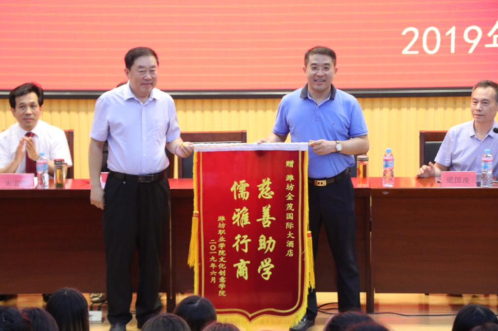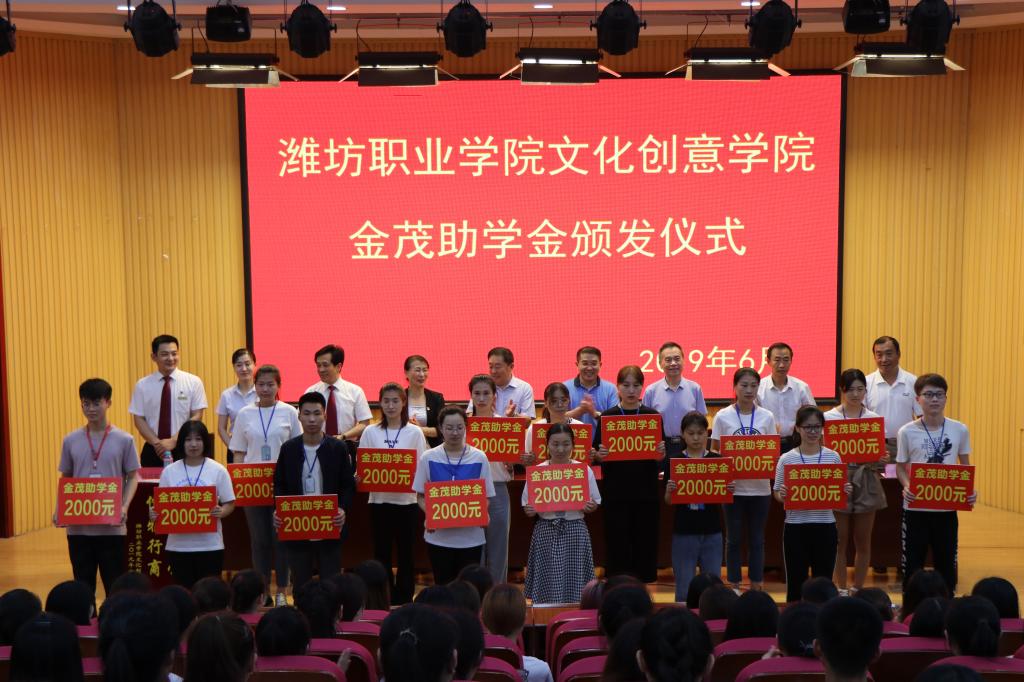 为了更好地帮助在校贫困学生完成学业,6月19日下午,学院在奎文校区创业中心报告厅举行“金茂助学金”颁发仪式。学院党委副书记宋桂言出席,潍坊金茂国际大酒店董事长庄玉冰等一行4人参加,学院团委学生工作处负责人及文化创意学院相关负责同志出席颁发仪式。