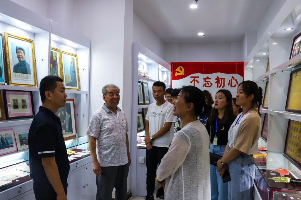 在中学街社区明德党支部。明德党支部是中学街社区的一面耀眼旗帜,该党支部2015年4月7日成立,现由20名离退休党员干部组成,自成立以来,他们发挥余热,无私奉献。牟学斌书记是社区红色文化传播者,他带领大家参观了社区红色文化微展馆,该展馆由牟学斌书记个人珍藏的红色历史画报、领袖像章、邮票等红色藏品1000余件。