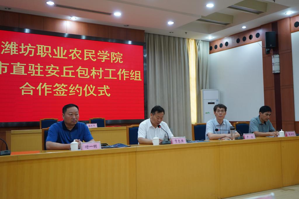 贺志强介绍了潍坊职业学院的办学优势和我院成功入选全国优质专科高等职业院校的基本情况,并就潍坊职业农民学院成立的背景、目的、方向以及主要职责、培训类别、培训模式、前一阶段开展的工作和取得成绩、今后的办学方向作了系统的阐述。贺志强指出:此次潍坊职业农民学院与市直驻安丘包村工作组签订合作协议,是深入贯彻习近平总书记视察山东重要讲话和教育部关于印发《高等学校乡村振兴科技创新行动计划(2018—2022年)》的通知精神,围绕打造乡村振兴“齐鲁样板”和“潍坊模式”升级版,落实潍坊市委书记惠新安在全市经济工作会议上的讲话:“发挥好潍坊职业农民学院平台作用”的实际行动。必将为推动潍坊农业全面升级、农村全面进步, 促进第一书记帮扶村集体经济增收,百姓致富,打造安丘农业品牌起到积极地作用。希望双方加强沟通,本着“优势互补、资源共享,科学发展”的原则,做好“三农”培训工作,为安丘市培养更多、更好的新型职业农民,为安丘农业发展做出积极的贡献。