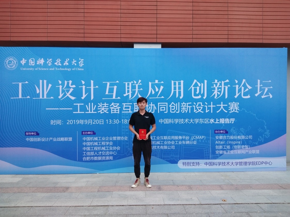 9月20日,由中国机械工业企业管理协会、中国机械工程学会、中国工程机械工业协会、工信部人才交流中心主办的工业设计互联应用创新论坛暨工业装备互联协同创新设计大赛颁奖典礼在中国科学技术大学举办。我院机电工程学院2017级数控技师班刘月昊同学应邀参加论坛。