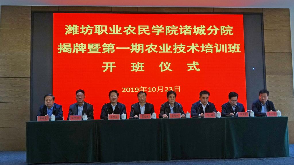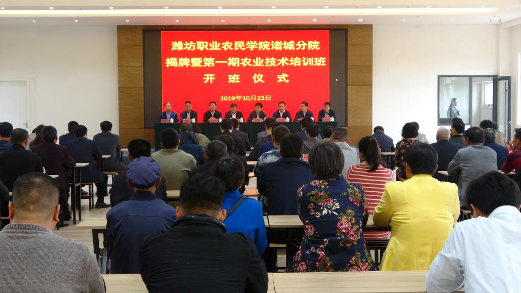 金秋十月,瓜果飘香。10月23日,潍坊职业农民学院诸城分院揭牌仪式暨2019年特色农产品品牌培育第十八期培训班开班仪式在诸城市永辉生态家庭农场培训中心举行,这是潍坊职业学院在潍坊市成立的第一家职业农民学院县级分院。潍坊市农业农村局二级调研员王金林;诸城市委副书记孙吉海、谭明,副市长杨连富出席签约和揭牌仪式。诸城市相关负责同志和来自镇街(园区)的农民培训学员,共100多人参加活动。贺志强副院长,潍坊职业学院继续教育学院负责同志和相关人员出席揭牌仪式。