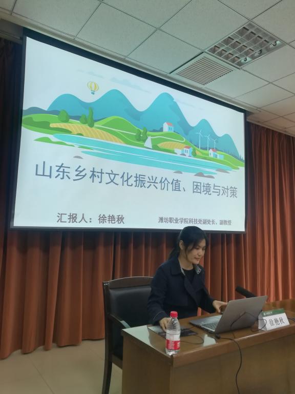 在专家交流环节,徐艳秋博士作了“山东乡村文化振兴价值、困境与对策”的主题发言,指出山东乡村文化振兴具有得天独厚的资源优势,乡村文化振兴和乡村振兴的其他工作紧密相连。从价值体系看,乡村文化振兴的文化场域和乡村振兴的产业场域、生态场域、治理场域构成了多场域耦合的科学系统。较之于有目共睹的成绩,山东乡村文化振兴依然存在着较为严重的发展不平衡和不充分,面对困境山东乡村文化振兴要通过综合平台建设,实现乡村文化振兴的提质增效。