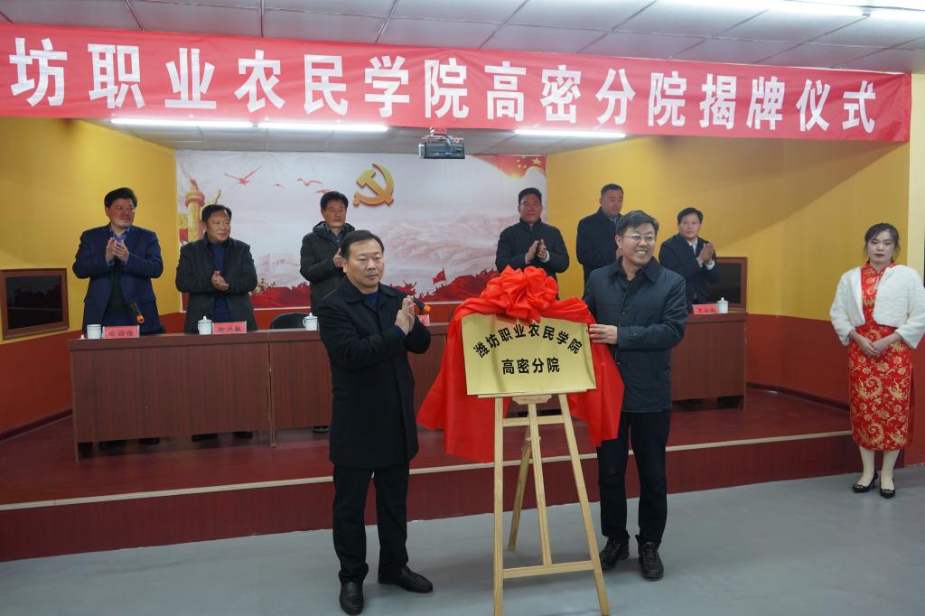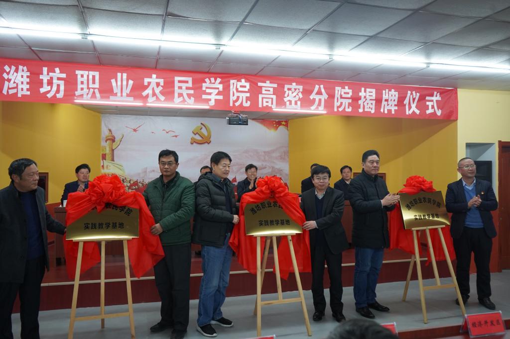 11月28日,潍坊职业农民学院第二家县市分院-高密分院及3个实践教学基地揭牌仪式在高密五龙河农场举行。高密分院所在地五龙河农场和实践教学基地高密松兴屯两处田园综合体被列入潍坊市级田园综合体,松兴屯田园综合体被列入省级田园综合体,成为潍坊市农业发展的新亮点。