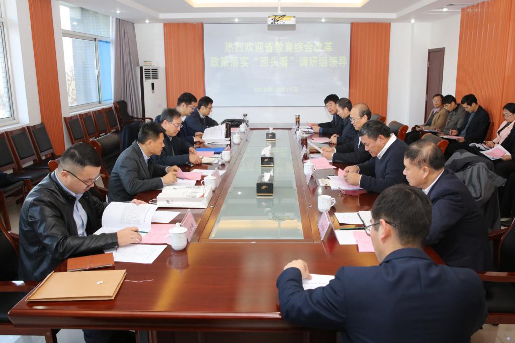 12月11日上午,以省财政厅二级巡视员董苏彭为组长的省教育厅等五部门联合工作组一行5人来我院调研。调研组在滨海校区清泽楼二楼会议室举行教育综合改革政策落实调研工作座谈会。学院党委书记马跃启、院长王家爱、副院长李瑞昌、纪委书记郭晓辉、副院长刘德强参加调研,相关职能部门负责同志参加座谈会。