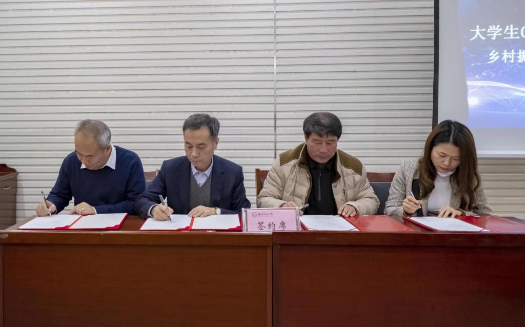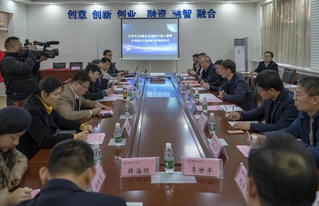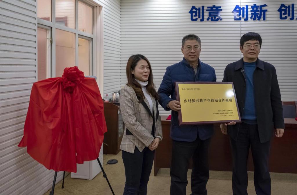 刘德强与潍坊市住建局安丘西许戈村第一书记、中国老教授协会创新创业教育委员会秘书长共同为乡村振兴政产学研用合作基地揭牌。文化创意学院主要负责同志和安丘西许戈村党支部委员、中国老教授协会创新创业教育委员会秘书长代表三方签署合作协议。三方将贯彻落实“大众创业、万众创新”、“乡村振兴战略”的相关政策,产教融合、协同发展,在乡村振兴、大学生就业创业等各方面合作双赢、共同发展。