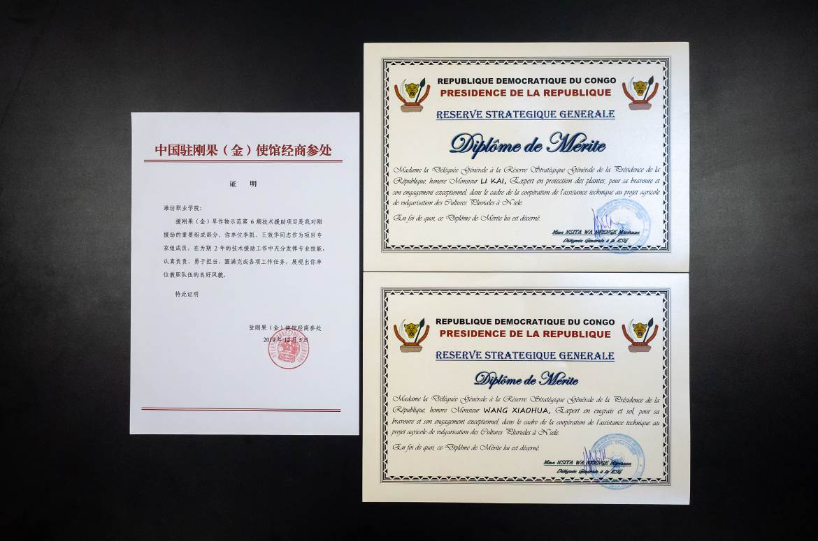 我国驻刚果(金)大使馆朱京大使,商务部驻刚果(金)经商处徐元杰参赞也多次来项目组看望我院两位专家,并对两位专家的工作给予了高度的肯定,表扬了我院两位专家在艰苦的地区不骄不躁、甘于奉献的精神,圆满完成援非任务,为国家和潍坊职业学院赢得了荣誉,为刚果(金)的农业科技发展贡献了力量。