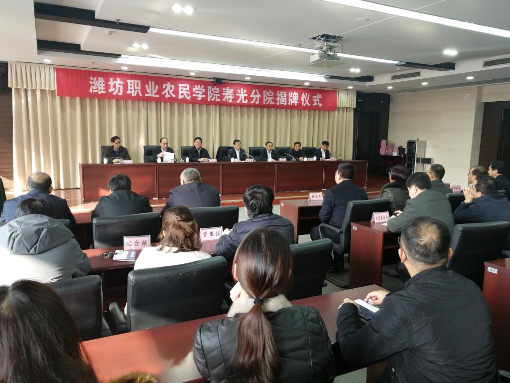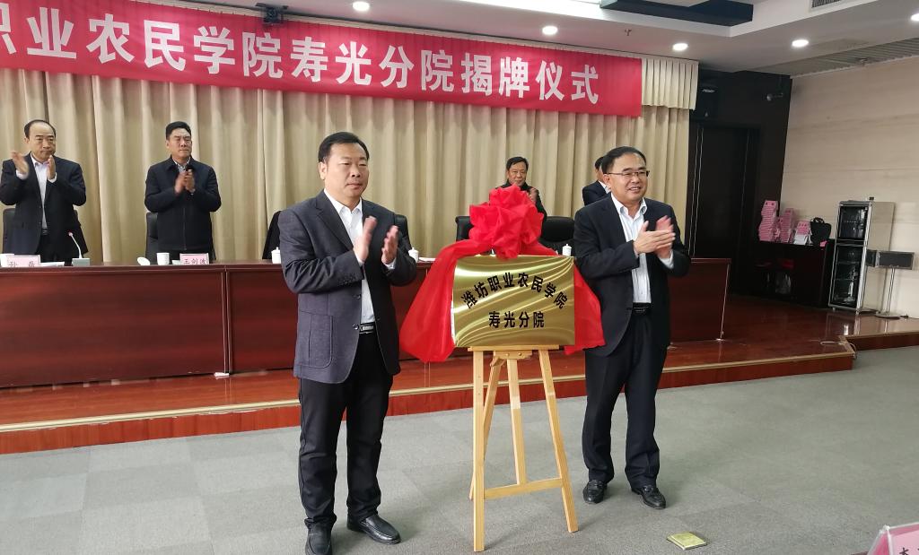 学院副院长贺志强与寿光市委副书记李永光共同为潍坊职业农民学院寿光分院揭牌。寿光市农业农村局党组书记、局长李秀欣与继续教育学院负责同志签订农业科技合作协议,依托寿光市农村干部学院共建潍坊职业农民学院寿光分院。潍坊市农业农村技术推广中心党支部书记柳洪艇、寿光市委组织部副部长李炳泉等同志为寿光高科技示范园、寿光现代农业高新技术试验示范基地、寿光田柳现代农业创新创业示范园、寿光三元朱乐义蔬菜合作社、寿光营里现代农业光电子技术示范基地等五个实践教学基地揭牌。
