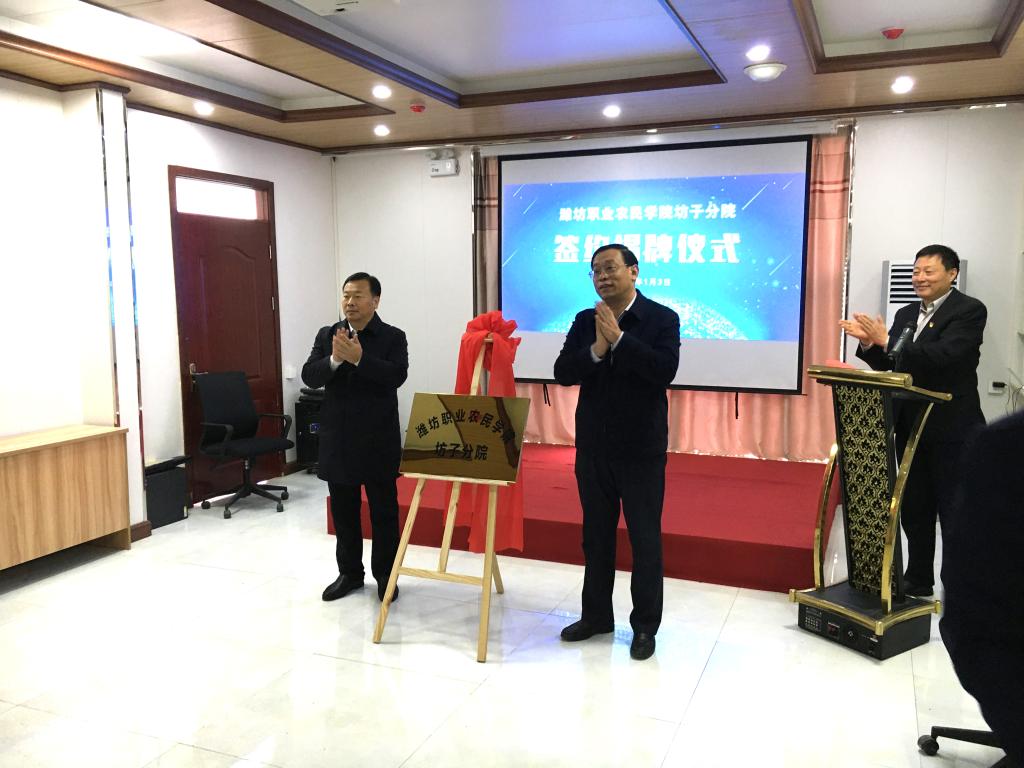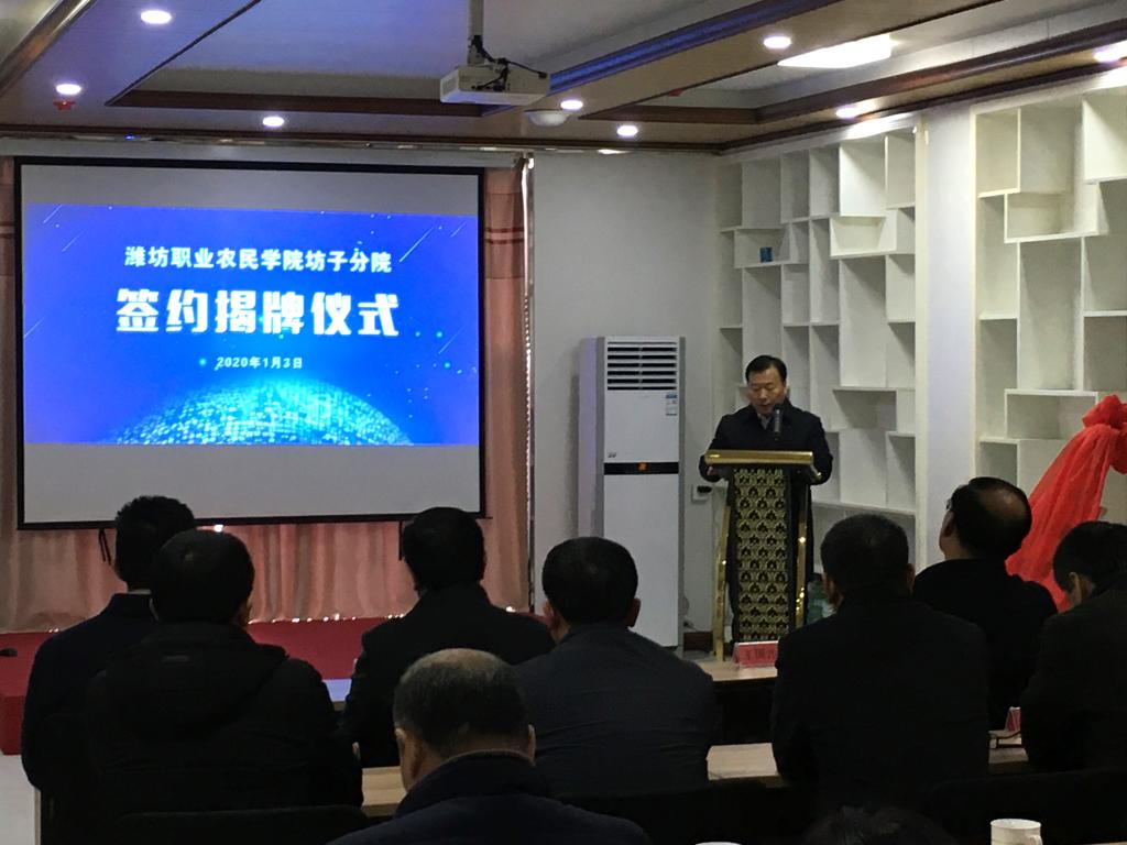 1月3日上午,潍坊职业农民学院坊子分院揭牌仪式在坊子区玉泉洼种植合作社举行,学院副院长贺志强与坊子区副区长王国光共同为分院揭牌。继续教育学院负责同志和坊子区农业局局长王兆劼共同签署科技合作协议,合作共建职业农民学院坊子分院。