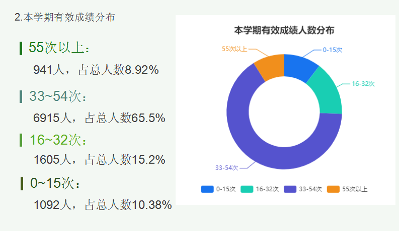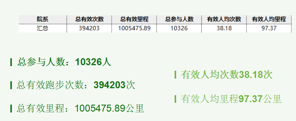 学院长期高度重视学生体质健康工作,积极开展学生课外体育活动,持续开展以信息化手段助推课外健身跑活动。本学期学院学生健康跑步活动共历时4个月时间。跑步单次里程达到2.4公里/男生,里程达到2.0/女生公里,学期累计达到40次为合格,55次满分。总参与人数达到10326人;总有效跑步次数394203次;总有效里程1005475.89公里;有效人均里程97.37公里。
