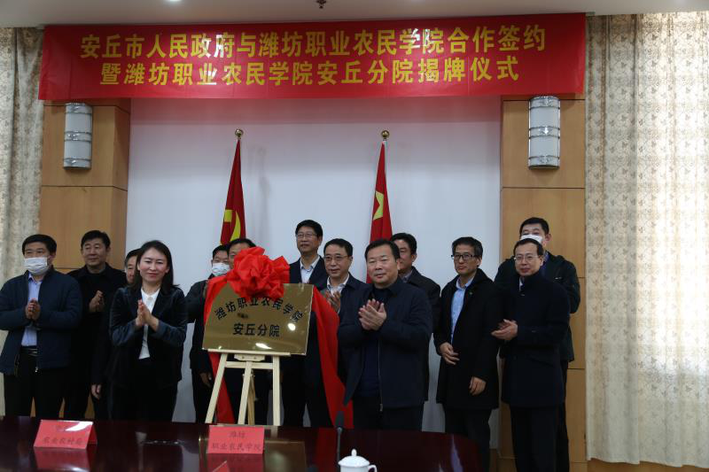 4月3日,潍坊职业农民学院安丘分院揭牌仪式在安丘市人民政府办公大楼举行,学院副院长贺志强与安丘市市委副书记刘艳芳共同为分院揭牌。继续教育学院负责同志和安丘市农业农村局局长郭伟共同签署合作协议,合作共建潍坊职业农民学院安丘分院。