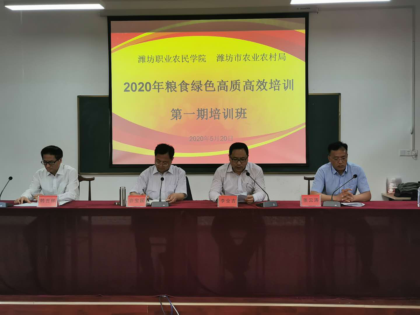 5月20日,潍坊职业农民学院、潍坊市农业农村局、潍坊普创职业技能培训中心联合组织的潍坊职业农民学院2020年粮食绿色高质高效观摩培训班在潍城培训基地开班。潍坊各县市区农业农村局种植业科长、乡镇农技站长和各县市区种粮大户、粮食专业合作社组织负责人等部分新型经营主体代表共80余人参加了培训。市农业农村局副局长许宝国、潍城区委副书记李全吉,潍坊市农业农村局农技中心主任张云涛以及潍坊职业学院继续教育学院相关同志出席培训班开班仪式。