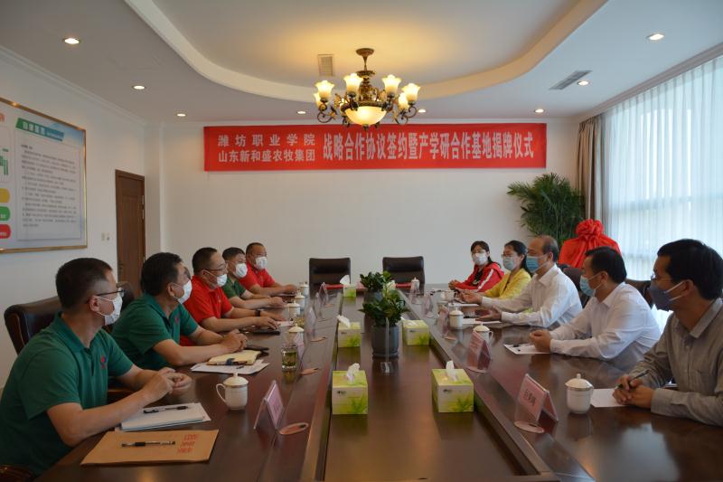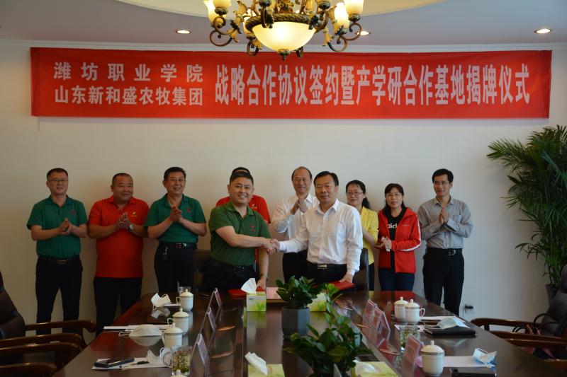 5月27日,我院与山东新和盛农牧集团战略合作协议签约暨产学研合作基地揭牌仪式在公司峡山总部会议室举行。学院党委书记马跃启、副院长贺志强,公司董事长宋卫东、总裁温海涛、常务副总裁姜奎华等校企领导出席,公司人事行政总监陈延志以及学院教务处、科技处(产学研合作中心)、食品药品学院主要负责同志参加活动。